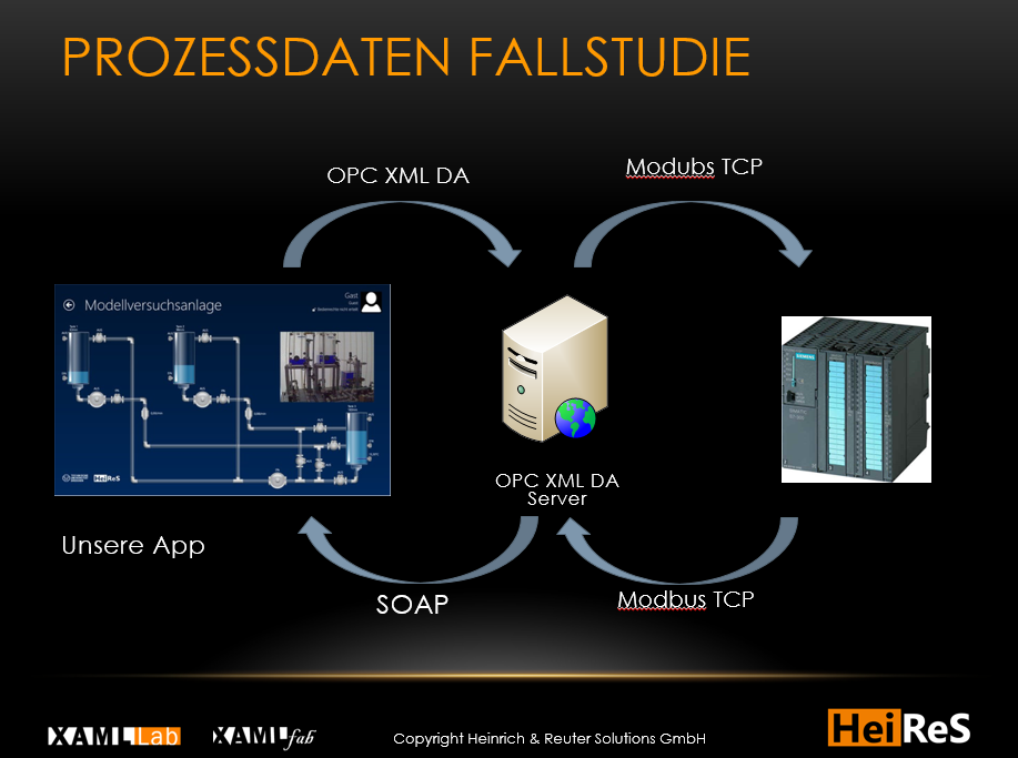 - OPC XML DA – OPC XML DA ist mit einer Kommunikation über HTTP und der XML-Struktur der Daten sehr gut geeignet um eine Prozesskommunikation für WinRT zu implementieren. Mit OPC XML DA wurden die Prozessdaten in den Fallstudien Apps (es waren zwei Apps, die mit unterschiedlichen Aspekten generiert wurden) übertragen.